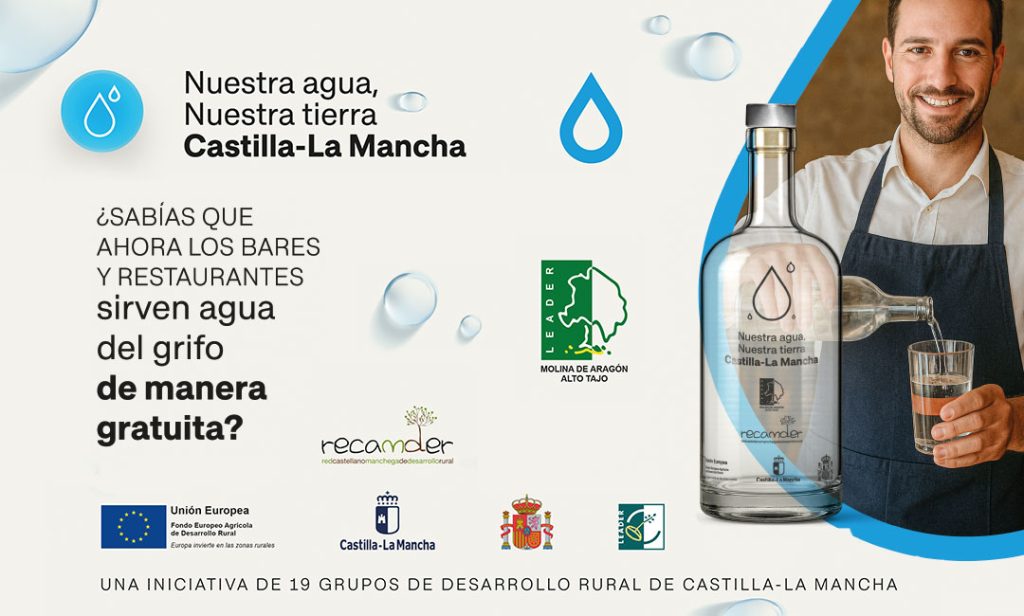 “Nuestra Agua, Nuestra Tierra” es un proyecto impulsado por RECAMDER y la Consejería de Agricultura, Ganadería y Desarrollo Rural, con financiación Leader, en el que participan 19 Grupos de Desarrollo Rural de las cinco provincias de Castilla-La Mancha. En total, se van a distribuir 100.000 botellas de cristal reutilizables y serigrafiadas, acompañadas de una campaña de sensibilización en redes sociales y medios para promover el consumo responsable y la reducción de residuos.